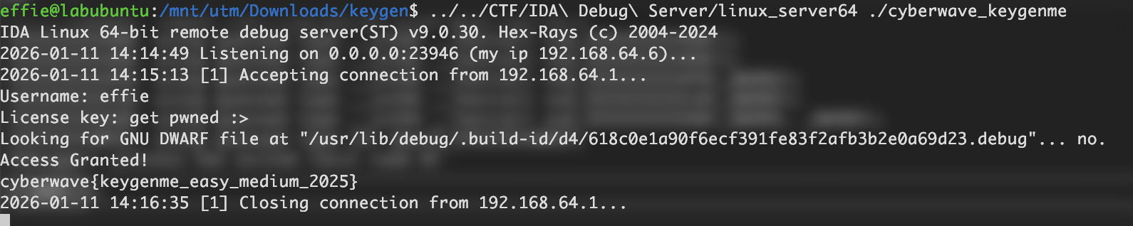 - Run ‘$IDA_INSTALL/IDA Debug Server/linuxserver64’ ‘./cyberwave_keygenme’ on a supported machine (in my case, an Ubuntu Server machine using UTM).